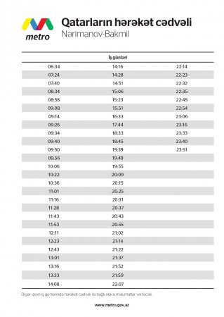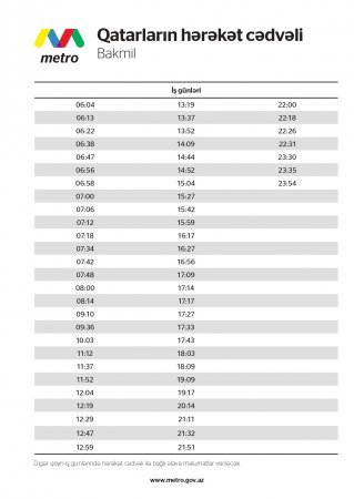 Noyabr ayının 1-də “Bakmil” stansiyası istiqamətində və əksinə olmaqla tətbiq ediləcək hərəkət qrafiki belə olacaq: